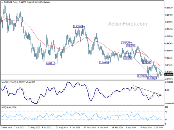 Range trading continues in EUR/GBP and intraday bias stays neutral. While rebound from 0.8382 could extend higher, outlook will stay bearish as long as 0.8498 resistance holds. Larger down trend should resume through 0.8382 at a later stage.