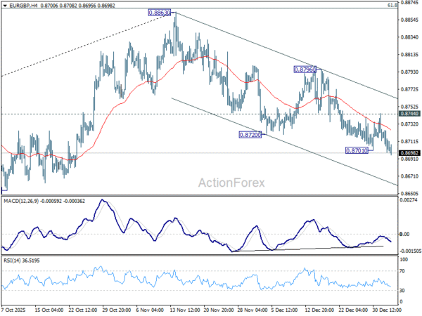 EUR/GBP’s fall from 0.8863 resumed by breaking 0.8701 and intraday bias is back on the downside. Further fall should be seen to 0.8631 cluster support (38.2% retracement of 0.8221 to 0.8663 at 0.8618). On the upside, though, firm break of 0.8744 will indicate short term bottoming, and turn bias back to the upside for 0.8796 resistance.