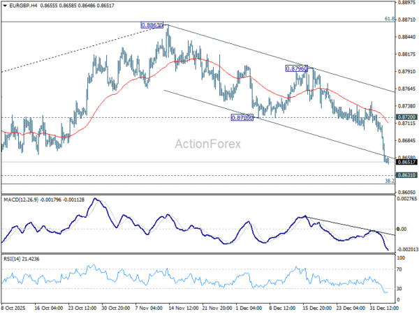 Intraday bias in EUR/GBP stays on the downside as fall from 0.8863 is in progress. Further fall should be seen to 0.8631 cluster support (38.2% retracement of 0.8221 to 0.8663 at 0.8618). Decisive break there will carry larger bearish implications. For now, risk will stay on the downside as long as 0.8720 support turned resistance holds, in case of recovery.