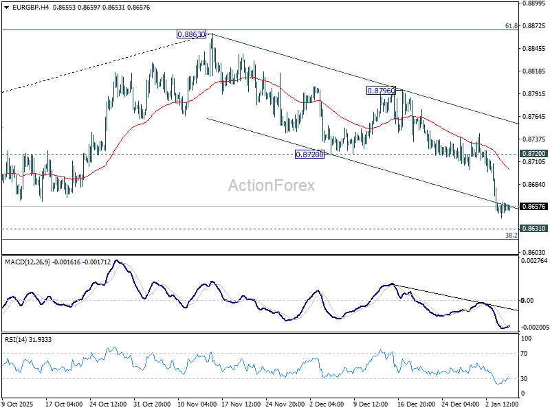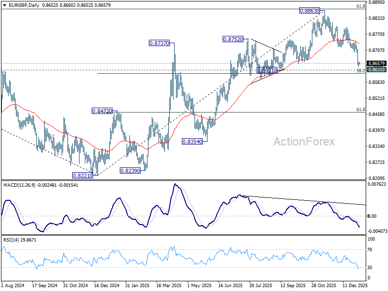 Intraday bias in EUR/GBP remains mildly on the downside. Fall from 0.8863 should target 0.8631 cluster support (38.2% retracement of 0.8221 to 0.8663 at 0.8618). Decisive break there will carry larger bearish implications. For now, risk will stay on the downside as long as 0.8720 support turned resistance holds, in case of recovery.