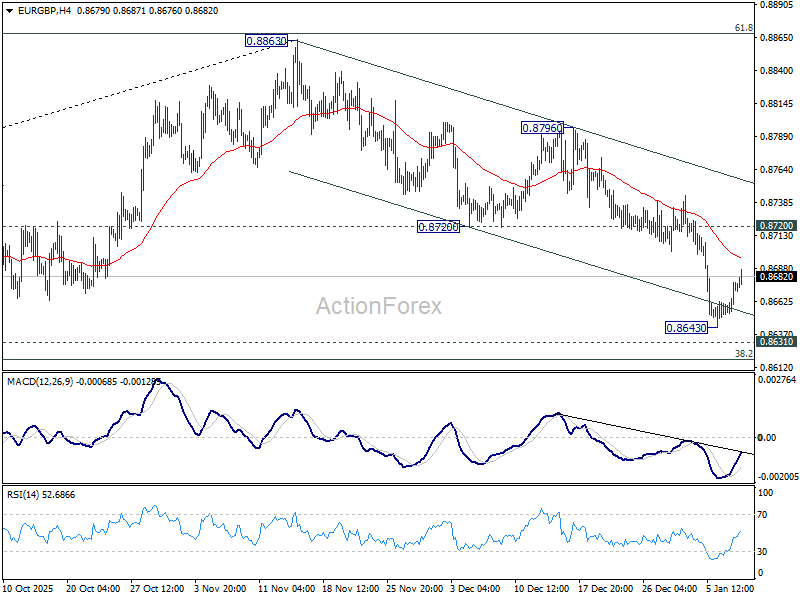Intraday bias in EUR/GBP is turned neutral as recovery from 0.8643 extends. Further decline is expected as long as 0.8720 support turned resistance holds. On the downside, decisive break of 0.8631 cluster support (38.2% retracement of 0.8221 to 0.8663 at 0.8618) will carry larger bearish implications. Nevertheless, sustained break of 0.8720 will bring stronger rally back to 0.8796 resistance instead.