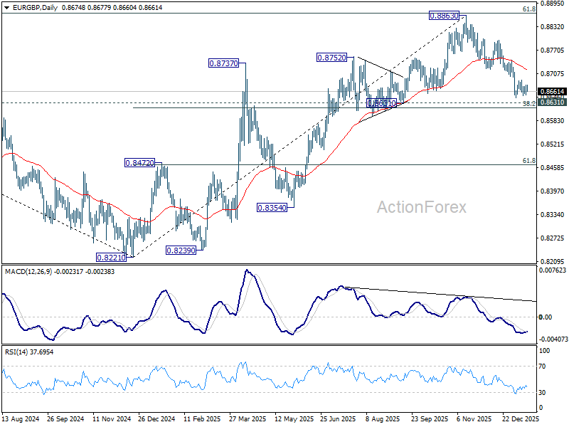 In the bigger picture, rise from 0.8221 medium term bottom (2024 low) is seen as a corrective move. Upside should be limited by 61.8% retracement of 0.9267 to 0.8221 at 0.8867. Sustained trading below 55 W EMA (now at 0.8622) should confirm that this corrective bounce has completed. In this case, deeper fall would be seen back to 0.8201/21 key support zone. However, decisive break of 0.8867 will suggest that EUR/GBP is already reversing whole decline from 0.9267 (2022 high). That should pave the way back to 0.9267.