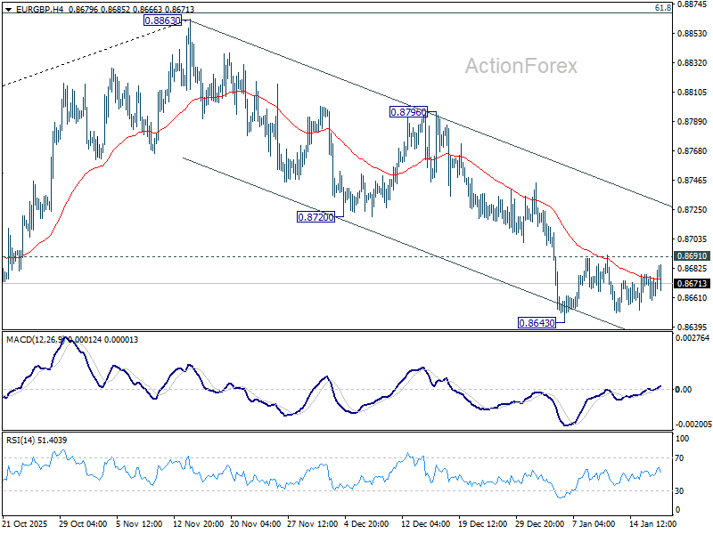 Range trading continues in EUR/GBP and intraday bias stays neutral for the moment. With 0.8691 resistance intact, further decline is in favor. On the downside, decisive break of 0.8631 cluster support (38.2% retracement of 0.8221 to 0.8663 at 0.8618) will pave the way to 61.8% retracement at 0.8466. Nevertheless, break of 0.8691 resistance will turn bias to the upside, for stronger rebound to 55 D EMA (now at 0.8716) first.