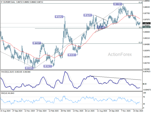 In the bigger picture, rise from 0.8221 medium term bottom (2024 low) is seen as a corrective move. Upside should be limited by 61.8% retracement of 0.9267 to 0.8221 at 0.8867. Sustained trading below 55 W EMA (now at 0.8623) should confirm that this corrective bounce has completed. In this case, deeper fall would be seen back to 0.8201/21 key support zone. However, decisive break of 0.8867 will suggest that EUR/GBP is already reversing whole decline from 0.9267 (2022 high). That should pave the way back to 0.9267.