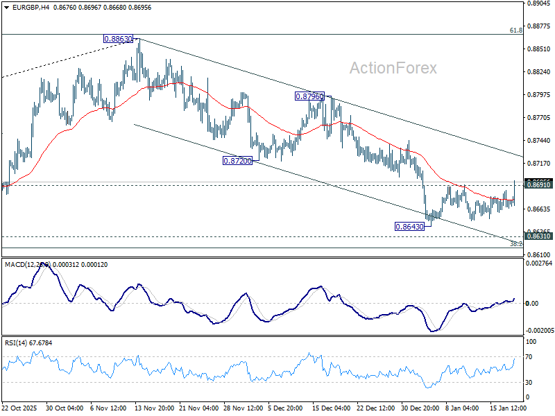 EUR/GBP’s break of 0.8691 resistance suggests short term bottoming at 0.8643. Intraday bias is back on the upside for 55 D EMA (now at 0.8716) first. Sustained break there will argue that whole fall from 0.8863 has already completed. On the downside, though, break of 0.8643 will resume the decline to 0.8631 cluster support (38.2% retracement of 0.8221 to 0.8663 at 0.8618).