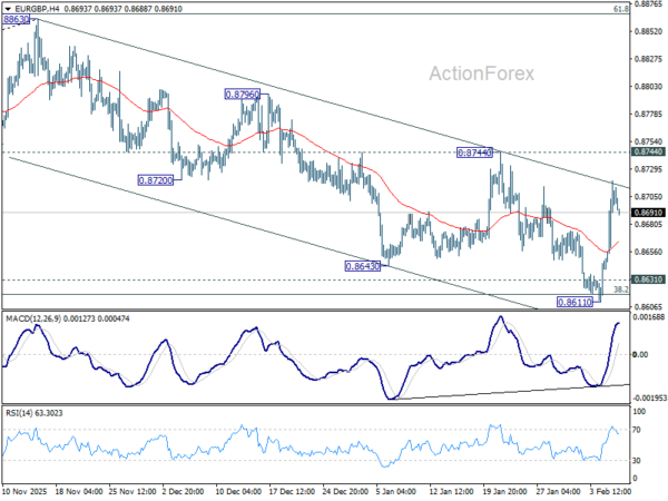 Intraday bias in EUR/GBP remains neutral first as it’s still bounded in range of 0.8611/8744. On the upside, firm break of 0.8744 will argue that fall from 0.8863 has completed as a correction. Intraday bias will be back to the upside for retesting 0.8863, with prospect of resuming larger up trend. Nevertheless, on the downside, decisive break of 0.8631 cluster support (38.2% retracement of 0.8221 to 0.8663 at 0.8618) will carry larger bearish implications.