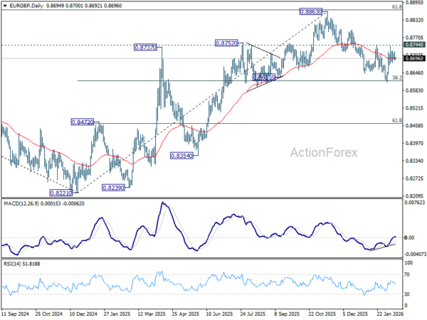 In the bigger picture, rise from 0.8221 medium term bottom (2024 low) is seen as a corrective move. Upside should be limited by 61.8% retracement of 0.9267 to 0.8221 at 0.8867. Sustained trading below 55 W EMA (now at 0.8631) should confirm that this corrective bounce has completed. In this case, deeper fall would be seen back to 0.8201/21 key support zone. However, decisive break of 0.8867 will suggest that EUR/GBP is already reversing whole decline from 0.9267 (2022 high). That should pave the way back to 0.9267.