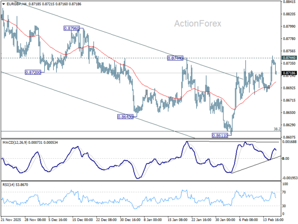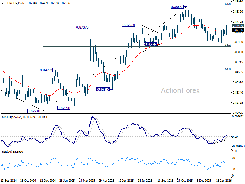 EUR/GBP breached 0.8744 resistance briefly, but failed to hold above there. Intraday bias stays neutral at this point. On the upside, decisive break of 0.8744 resistance will indicate that fall from 0.8863 has completed as a correction. Further rally should then be seen back to retest 0.8863 high. On the downside, sustained break of 38.2% retracement of 0.8221 to 0.8663 at 0.8618 will carry larger bearish implications and turn outlook bearish.