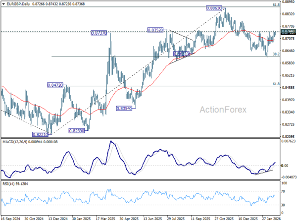 Intraday bias in EUR/GBP stays neutral and outlook is unchanged. On the upside, decisive break of 0.8744 resistance will indicate that fall from 0.8863 has completed as a correction. Further rally should then be seen back to retest 0.8863 high. On the downside, sustained break of 38.2% retracement of 0.8221 to 0.8663 at 0.8618 will carry larger bearish implications and turn outlook bearish.