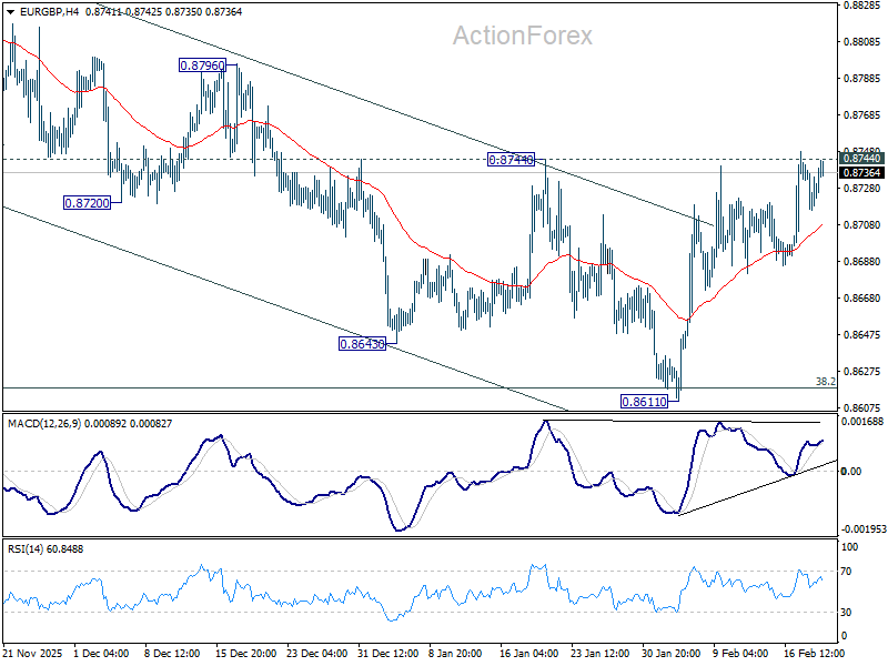 Intraday bias in EUR/GBP stays neutral and outlook is unchanged. On the upside, decisive break of 0.8744 resistance will indicate that fall from 0.8863 has completed as a correction. Further rally should then be seen back to retest 0.8863 high. On the downside, sustained break of 38.2% retracement of 0.8221 to 0.8663 at 0.8618 will carry larger bearish implications and turn outlook bearish.