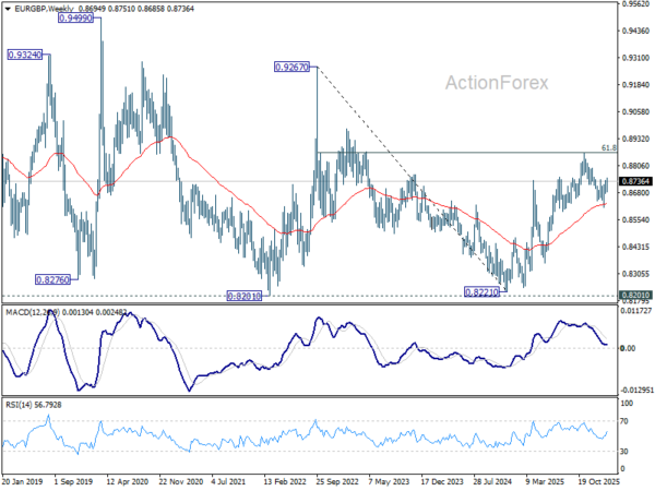 In the bigger picture, rise from 0.8221 medium term bottom (2024 low) is seen as a corrective move. Upside should be limited by 61.8% retracement of 0.9267 to 0.8221 at 0.8867. Sustained trading below 55 W EMA (now at 0.8632) should confirm that this corrective bounce has completed. In this case, deeper fall would be seen back to 0.8201/21 key support zone. However, decisive break of 0.8867 will suggest that EUR/GBP is already reversing whole decline from 0.9267 (2022 high). That should pave the way back to 0.9267.