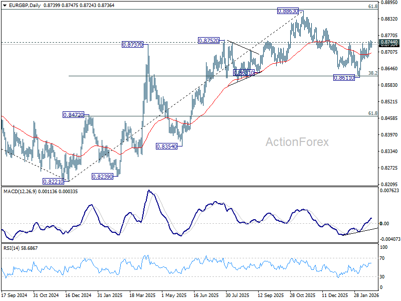 EUR/GBP breached 0.8744 resistance a few times last week but failed to sustain above there. Initial bias remains neutral this week first . On the upside, decisive break of 0.8744 should confirm that fall from 0.8863 has completed as a correction at 0.8661. Further rise should then be seen back to retest 0.8663 high. On the downside, break of 0.8685 support will turn bias back to the downside for 0.8611. Sustained break of 38.2% retracement of 0.8221 to 0.8663 at 0.8618 will carry larger bearish implications and turn outlook bearish.