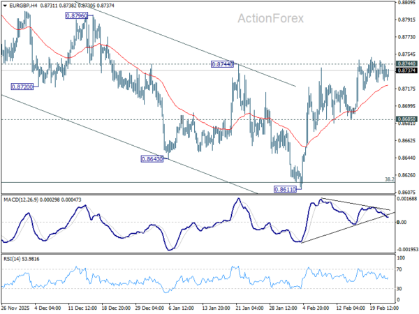 No change in EUR/GBP’s outlook. Intraday bias stays neutral with focus on 0.8744 resistance. Decisive break there should confirm that fall from 0.8863 has completed as a correction at 0.8661. Further rise should then be seen back to retest 0.8663 high. On the downside, break of 0.8685 support will turn bias back to the downside for 0.8611. Sustained break of 38.2% retracement of 0.8221 to 0.8663 at 0.8618 will carry larger bearish implications and turn outlook bearish.