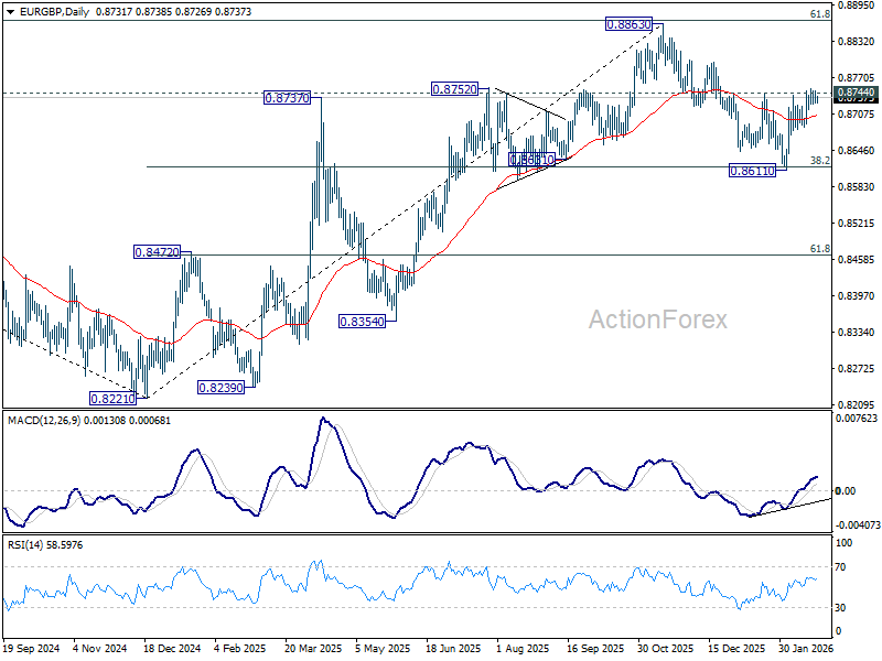 In the bigger picture, rise from 0.8221 medium term bottom (2024 low) is seen as a corrective move. Upside should be limited by 61.8% retracement of 0.9267 to 0.8221 at 0.8867. Sustained trading below 55 W EMA (now at 0.8636) should confirm that this corrective bounce has completed. In this case, deeper fall would be seen back to 0.8201/21 key support zone. However, decisive break of 0.8867 will suggest that EUR/GBP is already reversing whole decline from 0.9267 (2022 high). That should pave the way back to 0.9267.