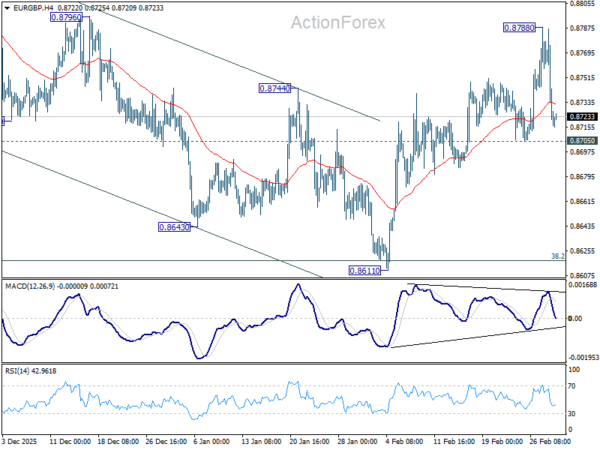 Intraday bias in EUR/GBP is turned neutral first with current steep retreat. Further rise is in favor as long as 0.8705 support holds. Above 0.8788 will resume the rebound from 0.8611 and target a retest on 0.8863 high. However, firm break of 0.8705 will argue that the pattern from 0.8863 is extending with another falling leg. In this case, bias will be turned back to the downside for 0.8611 support instead.