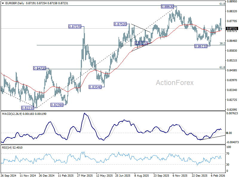 Intraday bias in EUR/GBP is turned neutral first with current steep retreat. Further rise is in favor as long as 0.8705 support holds. Above 0.8788 will resume the rebound from 0.8611 and target a retest on 0.8863 high. However, firm break of 0.8705 will argue that the pattern from 0.8863 is extending with another falling leg. In this case, bias will be turned back to the downside for 0.8611 support instead.