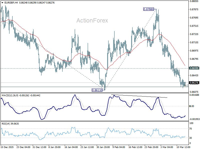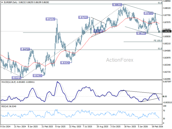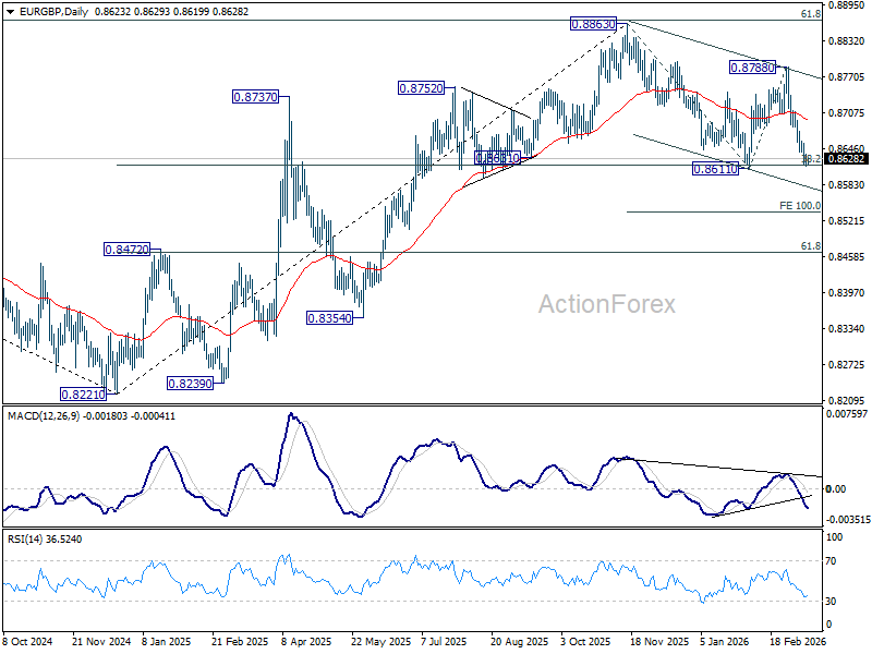 Intraday bias in EUR/GBP remains on the downside at this point. Firm break of 0.8611 will resume the whole decline from 0.8863, and target 100% projection of 0.8863 to 0.8611 from 0.8788 at 0.8536. On the upside, above 0.8659 minor resistance will turn intraday bias neutral again first.