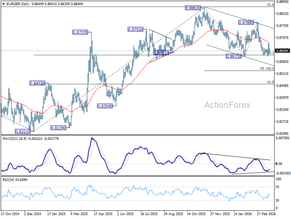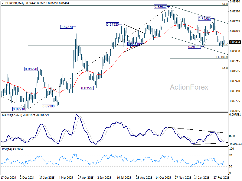 Intraday bias in EUR/GBP remains neutral for the moment. With 55 D EMA (now at 0.8682) intact, further decline is in favor. On the downside, firm break of 0.8611 will resume the whole fall from 0.8863 to 100% projection of 0.8863 to 0.8611 from 0.8788 at 0.8536. However, sustained break above 55 D EMA will turn bias back to the upside for 0.8788 resistance instead.