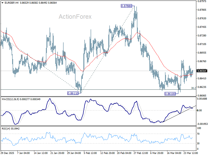 In the bigger picture, current development revived the case that whole rise from 0.8221 (2024 low) has completed at 0.8863, after rejection by 61.8% retracement of 0.9267 (2022 high) to 0.8221 at 0.8867. Sustained trading below 38.2% retracement of 0.8821 to 0.8863 at 0.8618 will confirm this case, and bring deeper fall to 61.8% retracement at 0.8466 at least. For now, medium term outlook is neutral at best as long as 0.8863 resistance holds.
