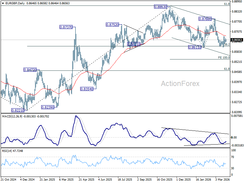Intraday bias in EUR/GBP remains neutral at this point. With 55 D EMA (now at 0.8681) intact, further decline is in favor. On the downside, firm break of 0.8611 will resume the whole fall from 0.8863 to 100% projection of 0.8863 to 0.8611 from 0.8788 at 0.8536. However, sustained break above 55 D EMA will turn bias back to the upside for 0.8788 resistance instead.