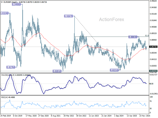 In the bigger picture, current development revived the case that whole rise from 0.8221 (2024 low) has completed at 0.8863, after rejection by 61.8% retracement of 0.9267 (2022 high) to 0.8221 at 0.8867. Sustained trading below 38.2% retracement of 0.8821 to 0.8863 at 0.8618 will confirm this case, and bring deeper fall to 61.8% retracement at 0.8466 at least. For now, medium term outlook is neutral at best as long as 0.8863 resistance holds.