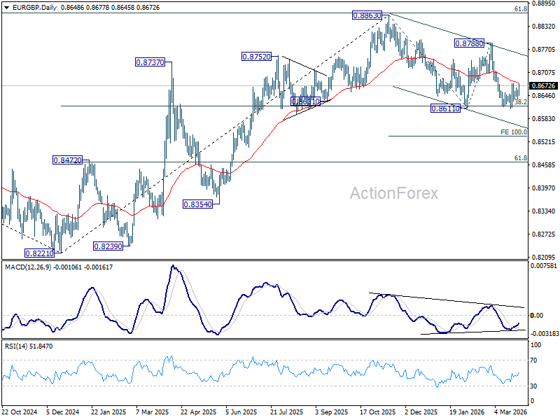 EUR/GBP stayed in range trading above 0.8610 last week. Initial bias remains neutral this week first. On the upside, sustained break above 55 D EMA (now at 0.8680) will confirm short term bottoming, and bring stronger rebound back to 0.8788 resistance. However, rejection by 55 D EMA will set up another fall through 0.8611 to 100% projection of 0.8863 to 0.8611 from 0.8788 at 0.8536.