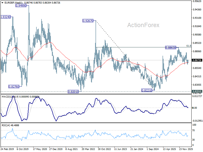 In the bigger picture, current development revived the case that whole rise from 0.8221 (2024 low) has completed at 0.8863, after rejection by 61.8% retracement of 0.9267 (2022 high) to 0.8221 at 0.8867. Sustained trading below 38.2% retracement of 0.8821 to 0.8863 at 0.8618 will confirm this case, and bring deeper fall to 61.8% retracement at 0.8466 at least. For now, medium term outlook is neutral at best as long as 0.8863 resistance holds.