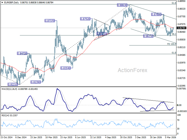 Intraday bias in EUR/GBP is mildly on the upside as rebound from 0.8610 resumes. Sustained trading above 55 D EMA (now at 0.8680) will confirm short term bottoming, and bring stronger rally back to 0.8788 resistance. However, rejection by 55 D EMA will set up another fall through 0.8611 to 100% projection of 0.8863 to 0.8611 from 0.8788 at 0.8536.