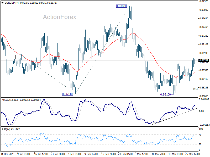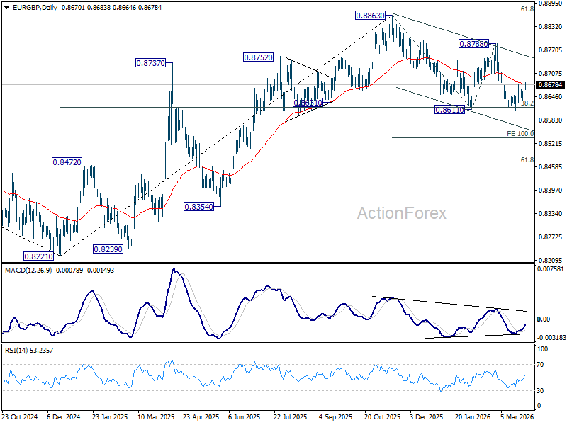 Intraday bias in EUR/GBP is mildly on the upside as rebound from 0.8610 resumes. Sustained trading above 55 D EMA (now at 0.8680) will confirm short term bottoming, and bring stronger rally back to 0.8788 resistance. However, rejection by 55 D EMA will set up another fall through 0.8611 to 100% projection of 0.8863 to 0.8611 from 0.8788 at 0.8536.