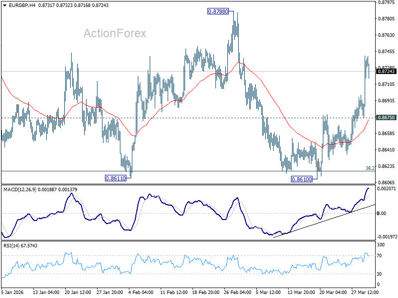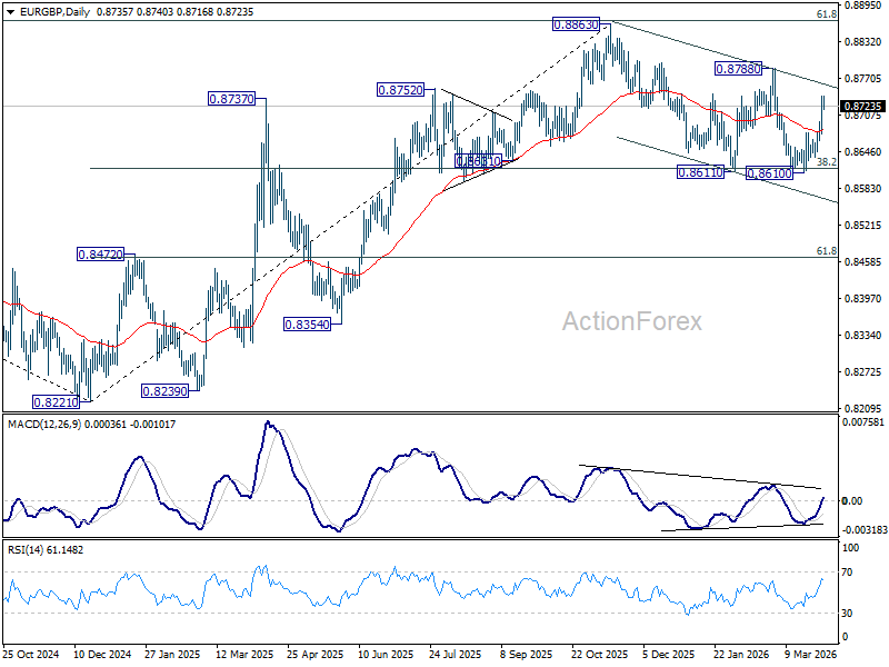Intraday bias in EUR/GBP remains on the upside as rebound from 0.8610 support extends. Further rally should be seen to 0.8788 resistance. Firm break there should confirm completion of the correction from 0.8863, and bring retest of this high. On the downside, below 0.8675 support will turn bias neutral first.
