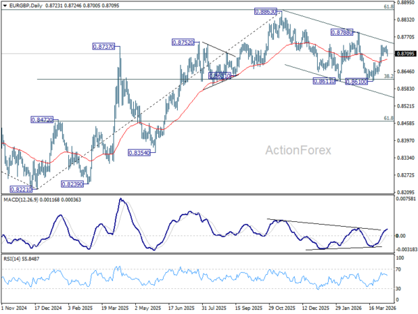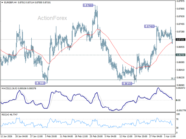 EUR/GBP is still bounded in consolidations below 0.8740 and intraday bias remains neutral. On the upside, above 0.8740 will resume the rebound from 0.8610 short term bottom to 0.8788 resistance next. However, break of 0.8675 will bring retest of 0.8610 low instead.