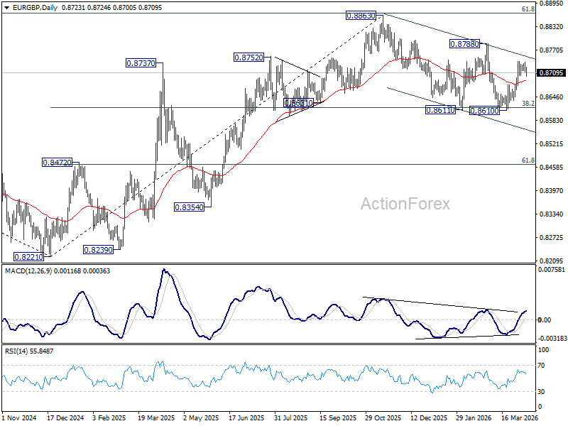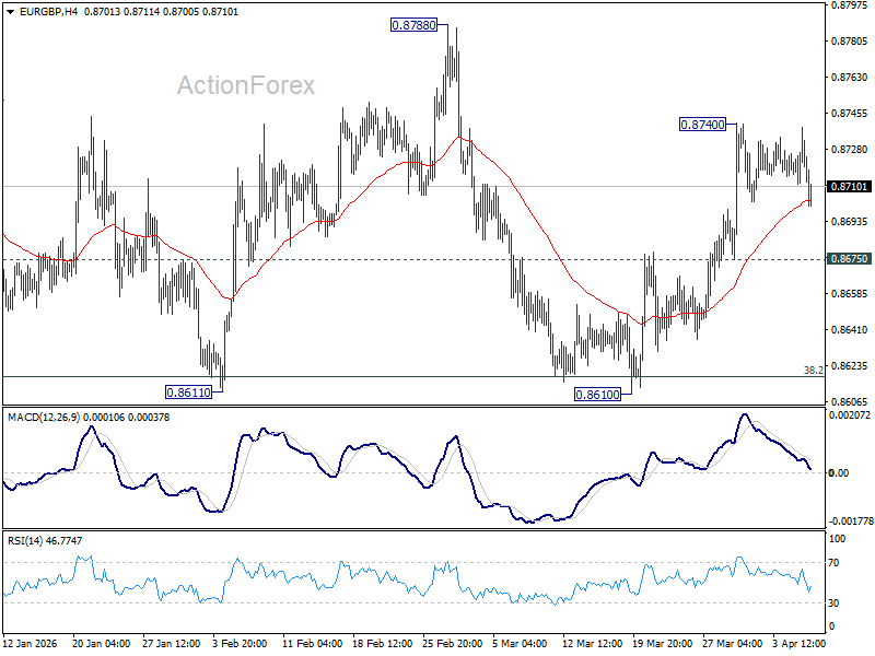 EUR/GBP is still bounded in consolidations below 0.8740 and intraday bias remains neutral. On the upside, above 0.8740 will resume the rebound from 0.8610 short term bottom to 0.8788 resistance next. However, break of 0.8675 will bring retest of 0.8610 low instead.