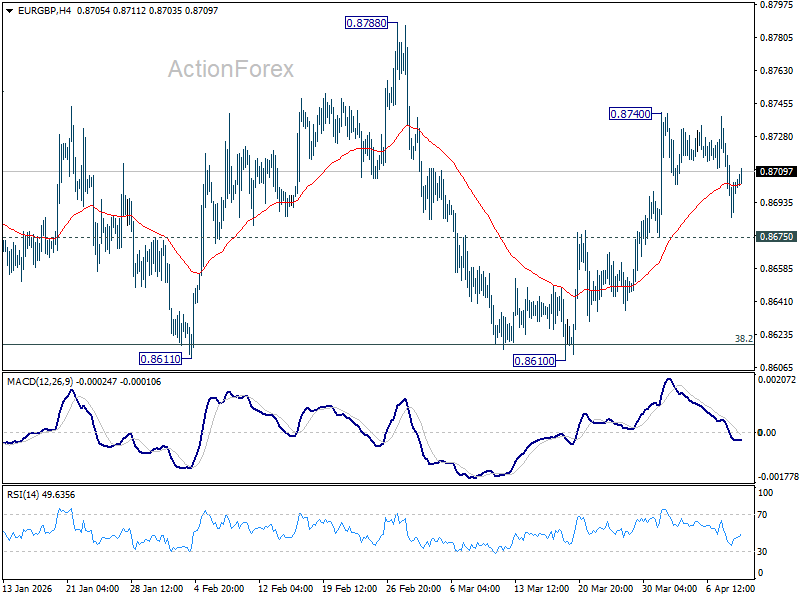 Intraday bias in EUR/GBP remains neutral as consolidations continues below 0.8740. On the upside, above 0.8740 will resume the rebound from 0.8610 short term bottom to 0.8788 resistance next. However, break of 0.8675 will bring retest of 0.8610 low instead.