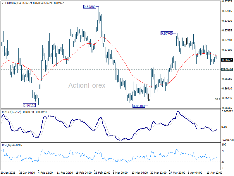 EUR/GBP is staying in consolidations from 0.8740 and intraday bias remains neutral. Further rise is mildly in favor as long as 0.8675 support holds. Break of 0.8740 will resume the rebound from 0.8610 to 0.8788 resistance. However, firm break of 0.8675 will turn bias back to the downside for retesting 0.8610 low instead.