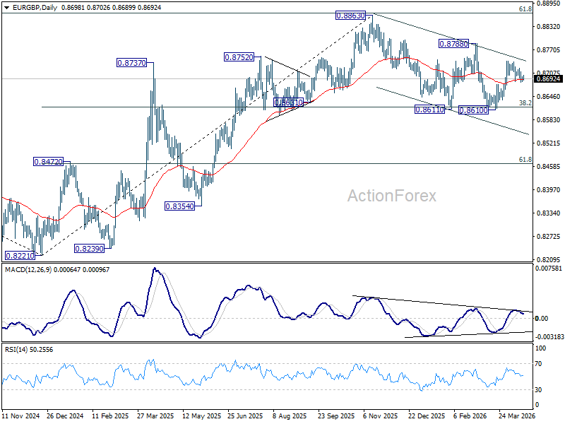 In the bigger picture, strong support was seen again from 38.2% retracement of 0.8821 to 0.8863 at 0.8618. Break of 0.8788 resistance will argue that larger rise from 0.8221 might be ready to resume through 0.8863 (2025 high). Nevertheless, sustained trading below 0.8618 should confirm bearish reversal, and bring deeper fall to 61.8% retracement at 0.8466 at least.