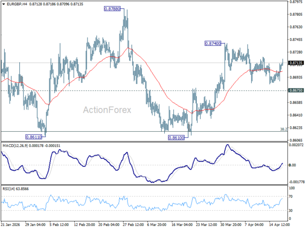 Intraday bias in EUR/GBP remains neutral for the moment, as consolidations continue below 0.8740. Further rise is mildly in favor as long as 0.8675 support holds. Break of 0.8740 will resume the rebound from 0.8610 to 0.8788 resistance. However, firm break of 0.8675 will turn bias back to the downside for retesting 0.8610 low instead.