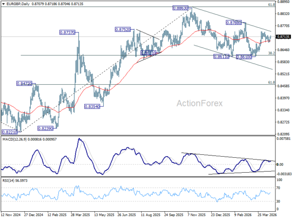 In the bigger picture, strong support was seen again from 38.2% retracement of 0.8821 to 0.8863 at 0.8618. Break of 0.8788 resistance will argue that larger rise from 0.8221 might be ready to resume through 0.8863 (2025 high). Nevertheless, sustained trading below 0.8618 should confirm bearish reversal, and bring deeper fall to 61.8% retracement at 0.8466 at least.
