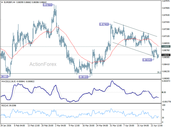 Intraday bias in EUR/GBP remains neutral and further fall is expected with 0.8685 support turned resistance intact. On the downside, below 0.8652 will resume the fall from 0.8740 to retest 0.8610 support next. Nevertheless, firm break of 0.8685 will dampen the bearish view and turn bias back to the upside for 0.8740 again.