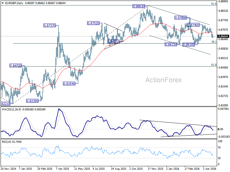 In the bigger picture, strong support was seen again from 38.2% retracement of 0.8821 to 0.8863 at 0.8618. Break of 0.8788 resistance will argue that larger rise from 0.8221 might be ready to resume through 0.8863 (2025 high). Nevertheless, sustained trading below 0.8618 should confirm bearish reversal, and bring deeper fall to 61.8% retracement at 0.8466 at least.