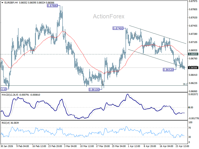 Intraday bias in EUR/GBP remains neutral at this point, and more consolidations could be seen. Further fall is expected with 0.8685 support turned resistance intact. On the downside, below 0.8652 will resume the fall from 0.8740 to retest 0.8610 support next. Nevertheless, firm break of 0.8685 will dampen the bearish view and turn bias back to the upside for 0.8740 again.