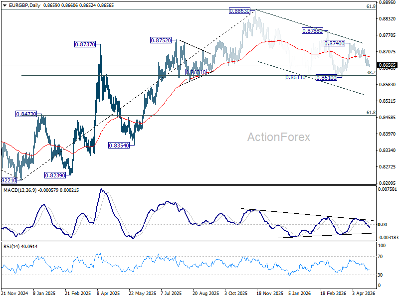 In the bigger picture, strong support was seen again from 38.2% retracement of 0.8821 to 0.8863 at 0.8618. Break of 0.8788 resistance will argue that larger rise from 0.8221 might be ready to resume through 0.8863 (2025 high). Nevertheless, sustained trading below 0.8618 should confirm bearish reversal, and bring deeper fall to 61.8% retracement at 0.8466 at least.