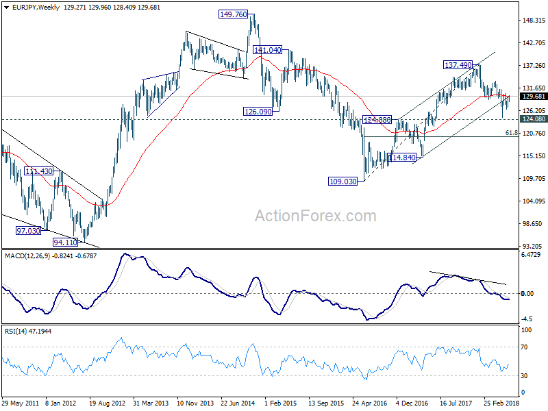 In the bigger picture, for now, EUR/JPY is holding above 124.08 key resistance turned support. Fall from 137.49 could be proven to be a correction. Decisive break of 133.47 resistance will confirm its completion and should extend the rise from 109.03 (2016 low) through 137.49 high. However, firm break of 124.08 will confirm trend reversal. That is, whole rise from 109.03 (2016 low) has completed at 137.49 already. In that case, deeper fall should be seen back to 61.8% retracement of 109.03 to 137.49 at 119.90 and below.