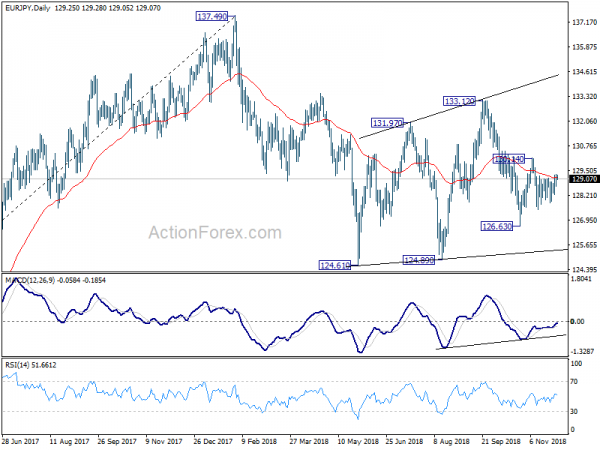 Intraday bias in EUR/JPY is mildly on the upside and further recovery could be seen. But after all, price actions from 127.49 are seen as a corrective pattern. And, near term outlook remains mildly bearish as long as 130.14 resistance holds. On the downside, below 128.24 minor support will target 126.63 support first. Break there will resume whole fall from 133.12 and target 124.08/89 support zone. On the upside, however, break of 130.14 will resume the rebound from 126.63 towards 133.12 resistance.