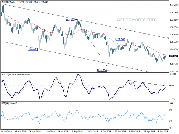 In the bigger picture, down trend from 137.49 is still in progress with the cross staying inside long term falling channel. Break of 118.62 will extend the fall to 109.48 (2016 low). On the upside, break of 127.50 resistance is needed to be the first sign of medium term reversal. Otherwise, outlook will remain bearish in case of strong rebound.