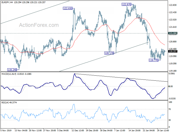 Intraday bias in EUR/JPY remains neutral for consolidation above 119.77 temporary low. Upside of recovery should be limited by 121.26 resistance to bring fall resumption. As noted before, corrective rise from 115.86 should be completed at 122.87, on bearish divergence condition in daily MACD. On the downside, break of 122.87 will pave the way to retest 115.86 low.
