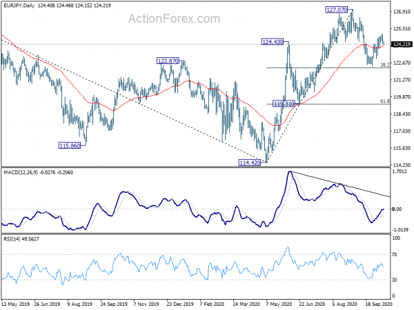 Intraday bias in EUR/JPY is turned neutral with current retreat. But with 123.84 minor support intact, further rise is still in favor. Break of 125.08 will extend the rebound from 122.37 to retest 127.07 high. Decisive break there will resume larger rally from 114.42. On the downside, however, break of 123.84 will turn bias back to the downside for 38.2% retracement of 114.42 to 127.07 at 122.23 instead.