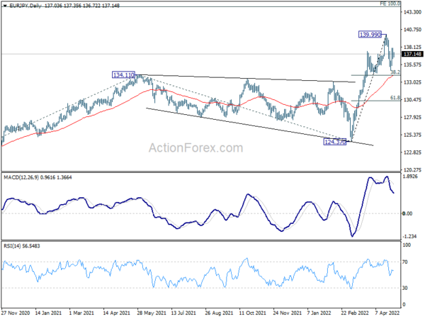 Intraday bias in EUR/JPY remains neutral first. Consolidation from 139.99 could extend further. But downside should be contained by 38.2% retracement of 124.37 to 139.99 at 134.02 to bring rebound. On the upside, firm break of 139.99 will resume larger up trend for 144.06 medium term projection level.