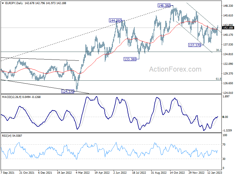 Intraday bias in EUR/JPY remains neutral with immediate focus on 142.84 resistance. Decisive break there will argue that the correction from 148.38 has completed at 137.37 already. Further rise would be seen to 146.71 resistance next. On the downside, firm break of 155.33 will resume the whole decline from 148.38 to 135.40 fibonacci level.