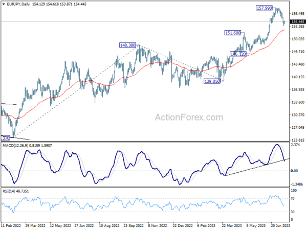 EUR/JPY recovered after falling to 153.32 and intraday bias is turned neutral first. Further decline is in favor as long as 155.66 minor resistance holds. Below 153.32 will target 55 D EMA (now at 152.36) and below. nevertheless, above 155.66 will turn bias back to the upside for retesting 157.99 high instead.
