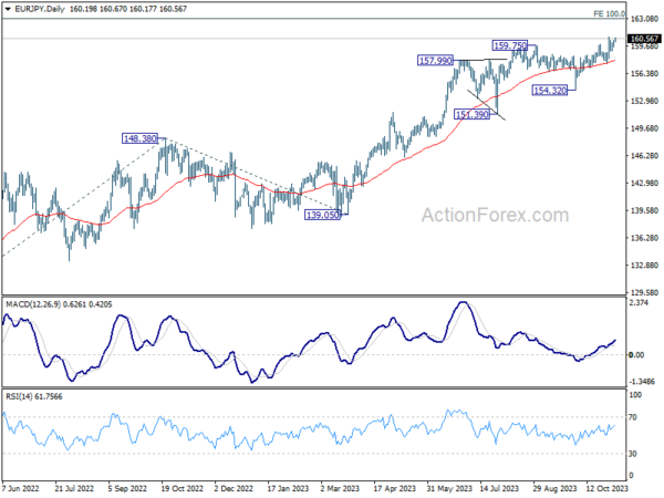 In the bigger picture, rise from 114.42 (2020 low) is in progress. Next target is 100% projection of 124.37 to 148.38 from 139.05 at 163.06. On the downside, break of 154.32 support is needed to be the first sign of medium term topping. Otherwise, outlook will remain bullish even in case of deep pullback.